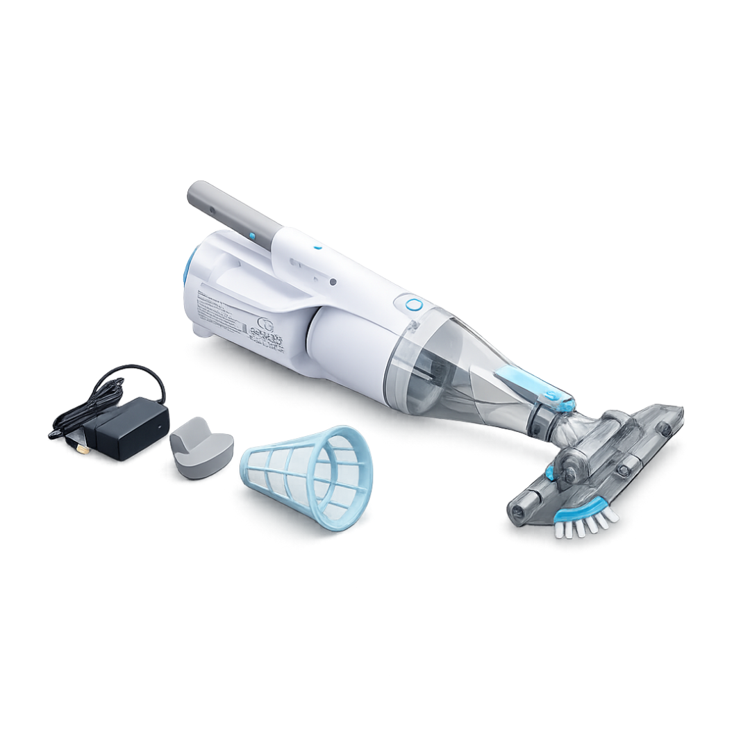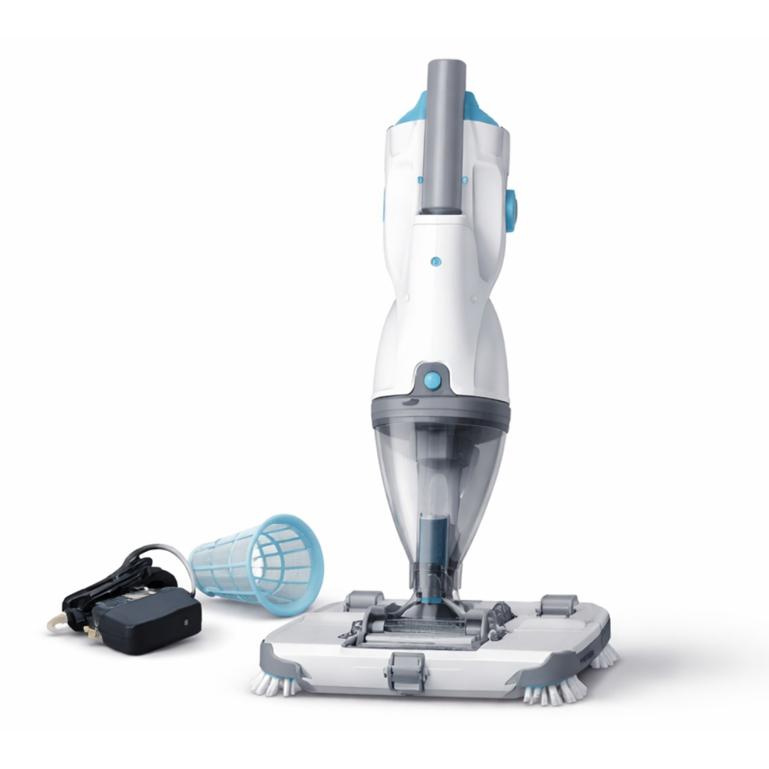 Zur leichten und schnellen Schmutzentfernung des Schwimmbades geeignet. Das kabellose Reinigungsgerät ist an eine *Teleskopstange (*nicht im Lieferumfang enthalten) anschließbar. Kabellose Reinigung in wenigen Minuten auch von schwer zugänglichen Bereichen. Ein abnehmbarer Schwenkkopf und Borsten am Saugkopf beseitigen effektiv jeden Schmutz. Transparentes Cover des Auffangbehälter mit einem Fassungsvermögen von 0,55 Liter. Bis zu 30 Minuten Saugleistung, dank des wiederaufladbaren Lithium-Ionen-Akkus.